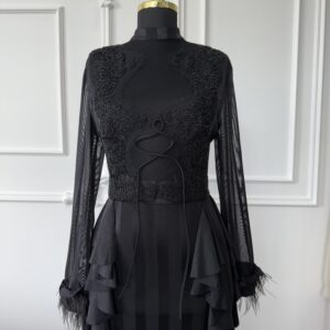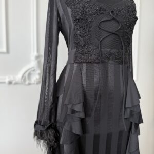 Siyah Tüy Manşetli Taş İşlemeli Uzun Elbise