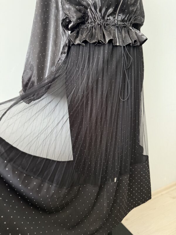 Zamansız şıklık arayan kadınlar için özel bir tasarım! Parlak saten görünümü ve puantiyeli tül detaylarıyla göz alıcı bu siyah etek, hem özel davetlerde hem de günlük kombinlerde stilinizi yansıtmanız için tasarlandı.